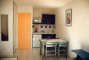 ![]() Köket : ett bord med 4 stolar, mikrovågsugn, elplatta, kylskåp, och köksservis för 6 personer. |